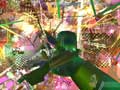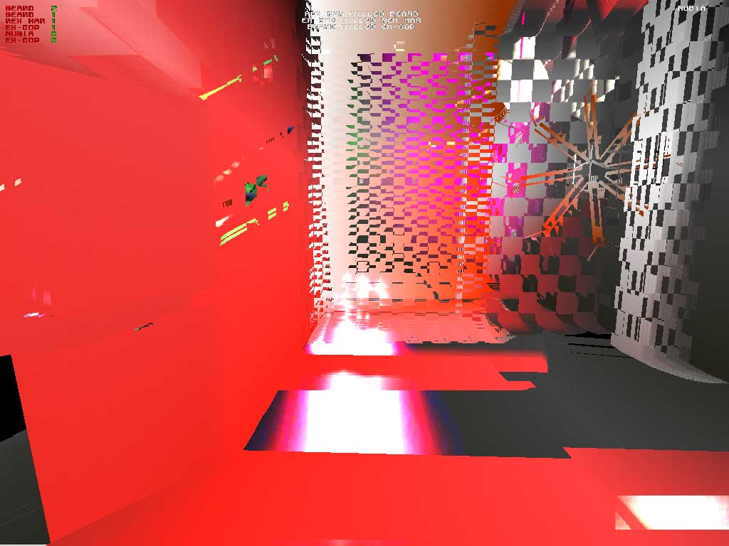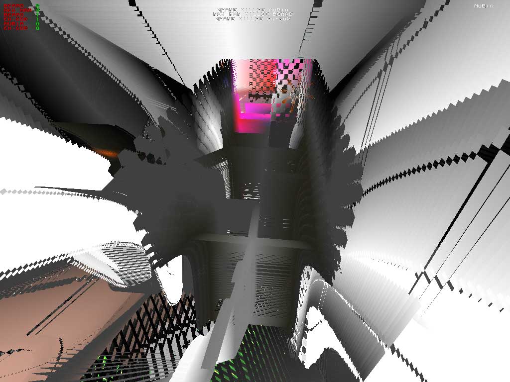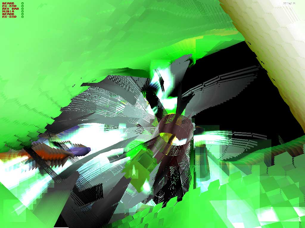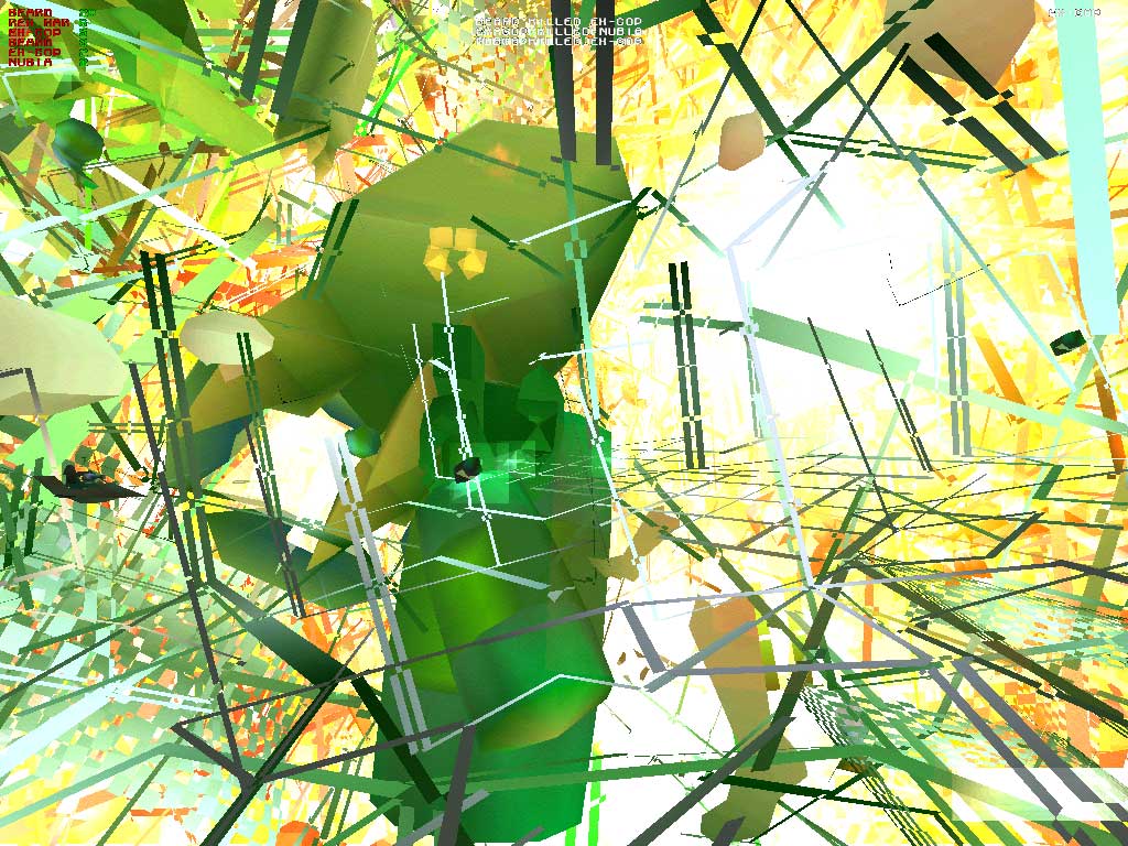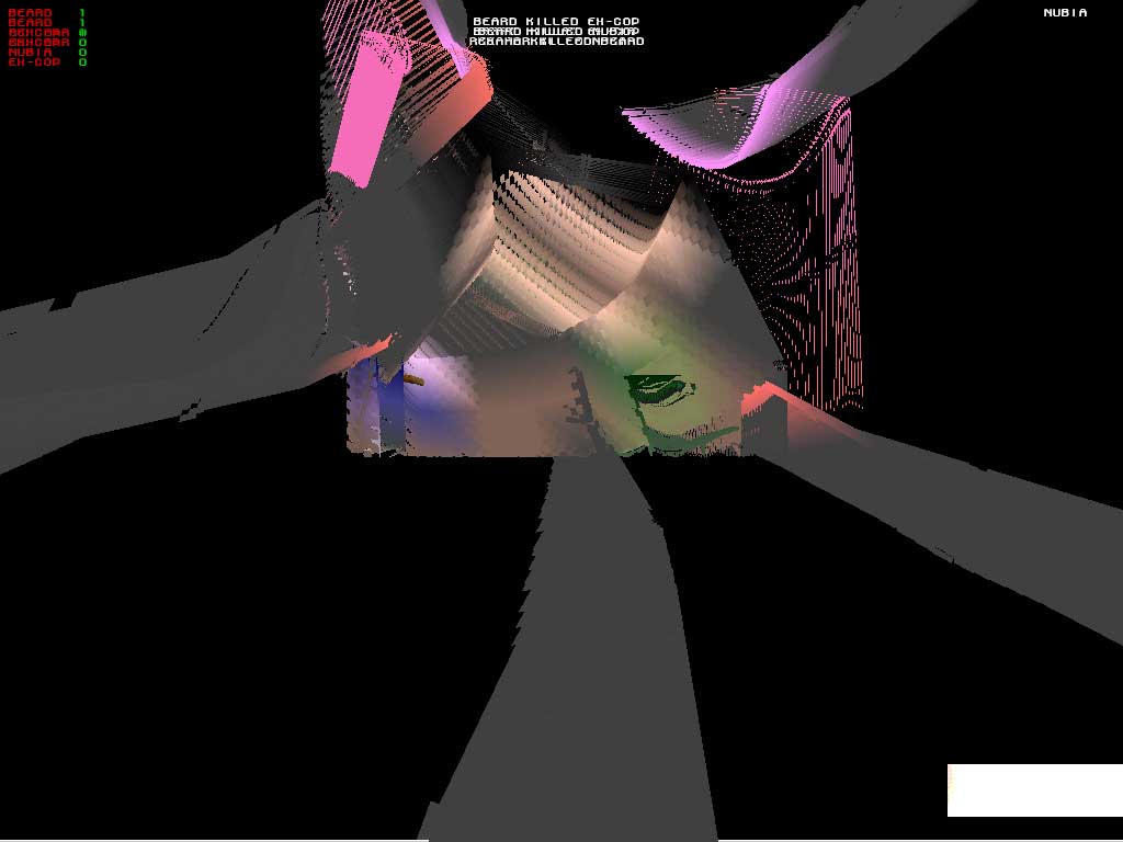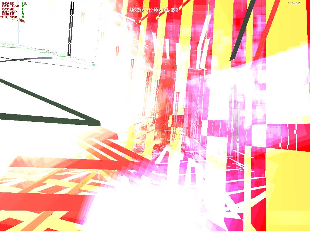 The hacked graphics and sound engine re-interprets the recorded narrative of the online match. Using a static script of events FSKN duplicates the players actions in an abstract architectural space, full of trails and glitches. FSKN toys with the idea of a videogame 'attract mode' (as does Q), reusing the terminology but divorcing it from the actual act of game playing to create a painterly documentary of a networked deathmatch..