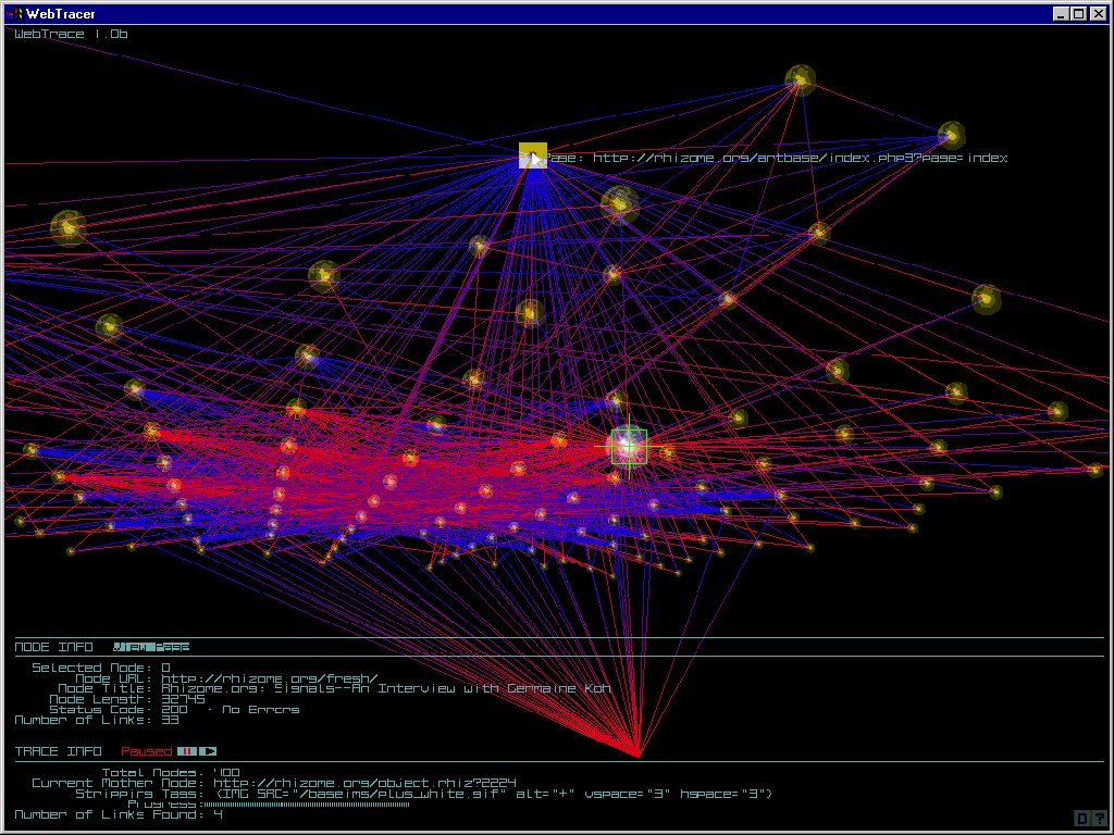 Images www.microsoft.com (run to approx 300 nodes) microsoft.com at several hundred nodes, spiral pattern simple tower structures spiral pattern, concertina shape www.google.com (run to approx 400 nodes) highly interwoven pattern overview of the structure side view of structure showing masts and levels within the structure, aligned to a mid plane www.rhizome.org (run to approx 400 nodes) overview of the structure, aptly rhizomatic. central base plane of the structure 2nd overview of structure showing distributed network arrangement www.intel.com (run to approx 400 nodes) elongated crown form base of the crown top of crown structure www.cybergeography.org (run to approx 400 nodes) overview of plateau-like structure underneath main plateau plan view eye level on main plateau www.nullpointer.co.uk (run to approx 400 nodes) multi plateau structure- overview plan view of seperate centres under base of central plateau Contact: webtracer@nullpointer.co.uk nullpointer.2001